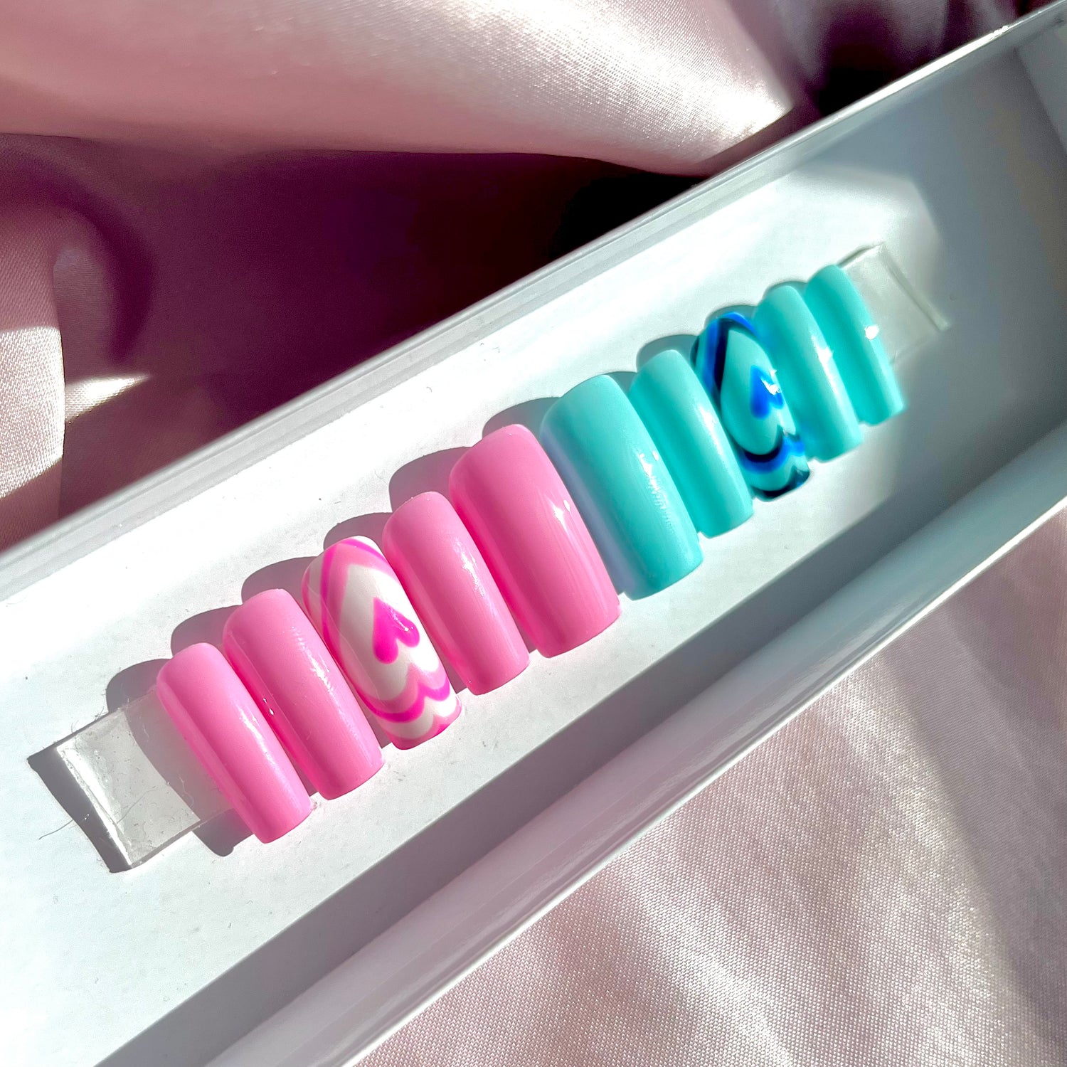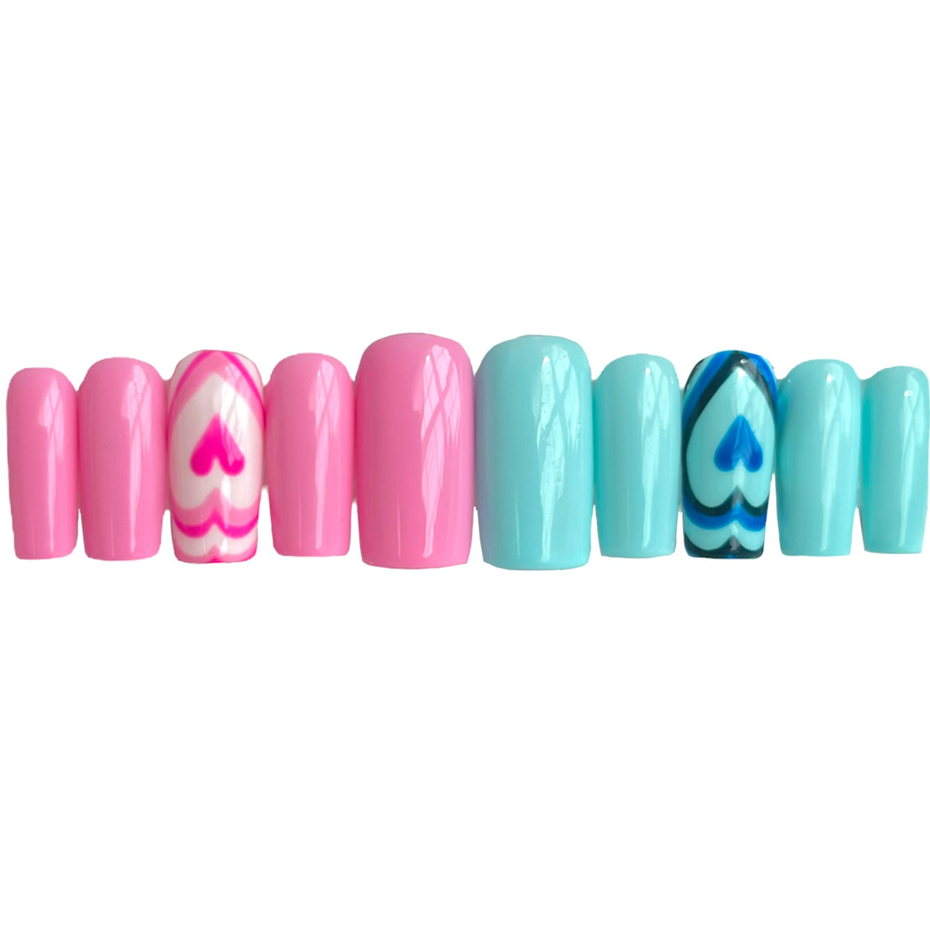 Pink and blue nails with a heart design on the middle finger.
