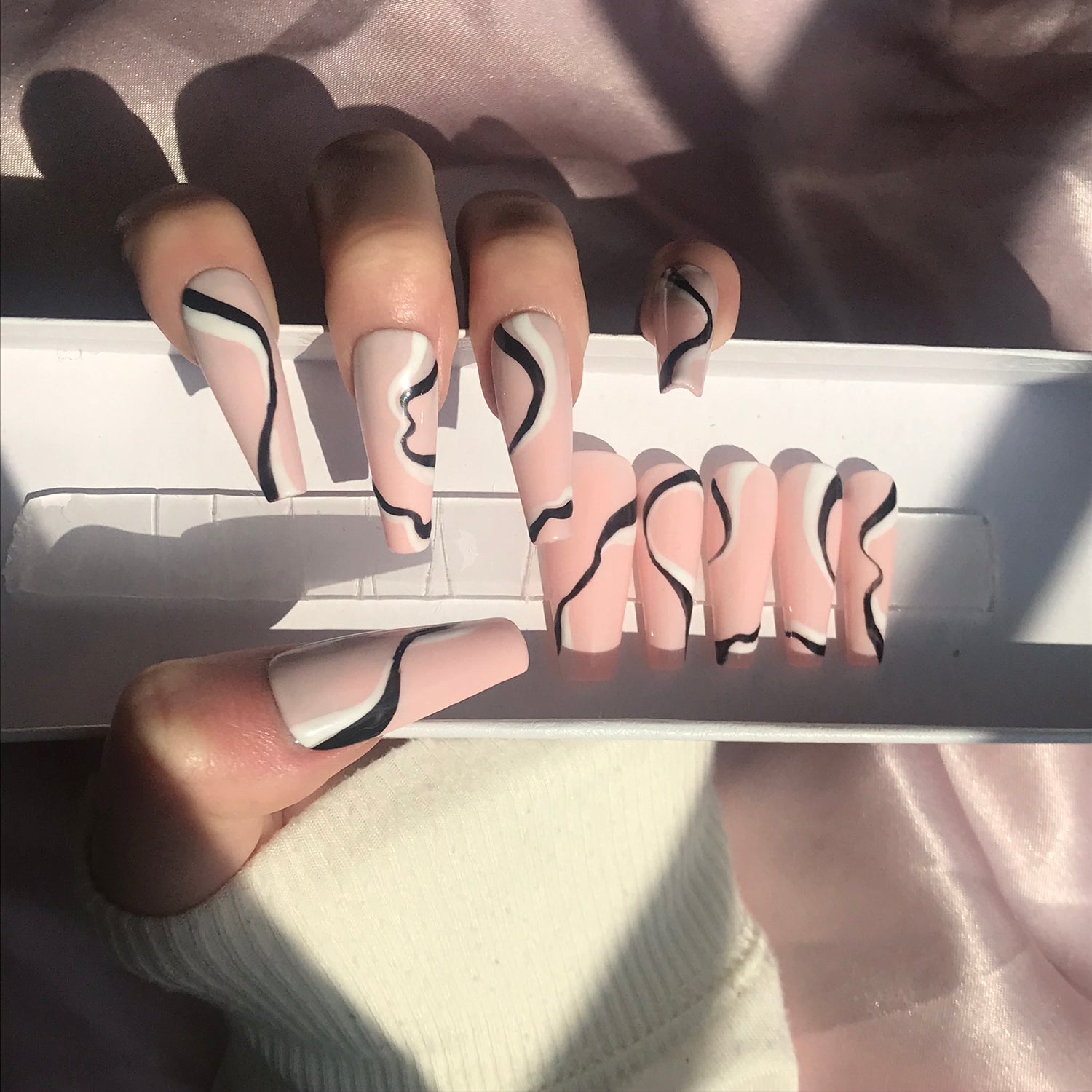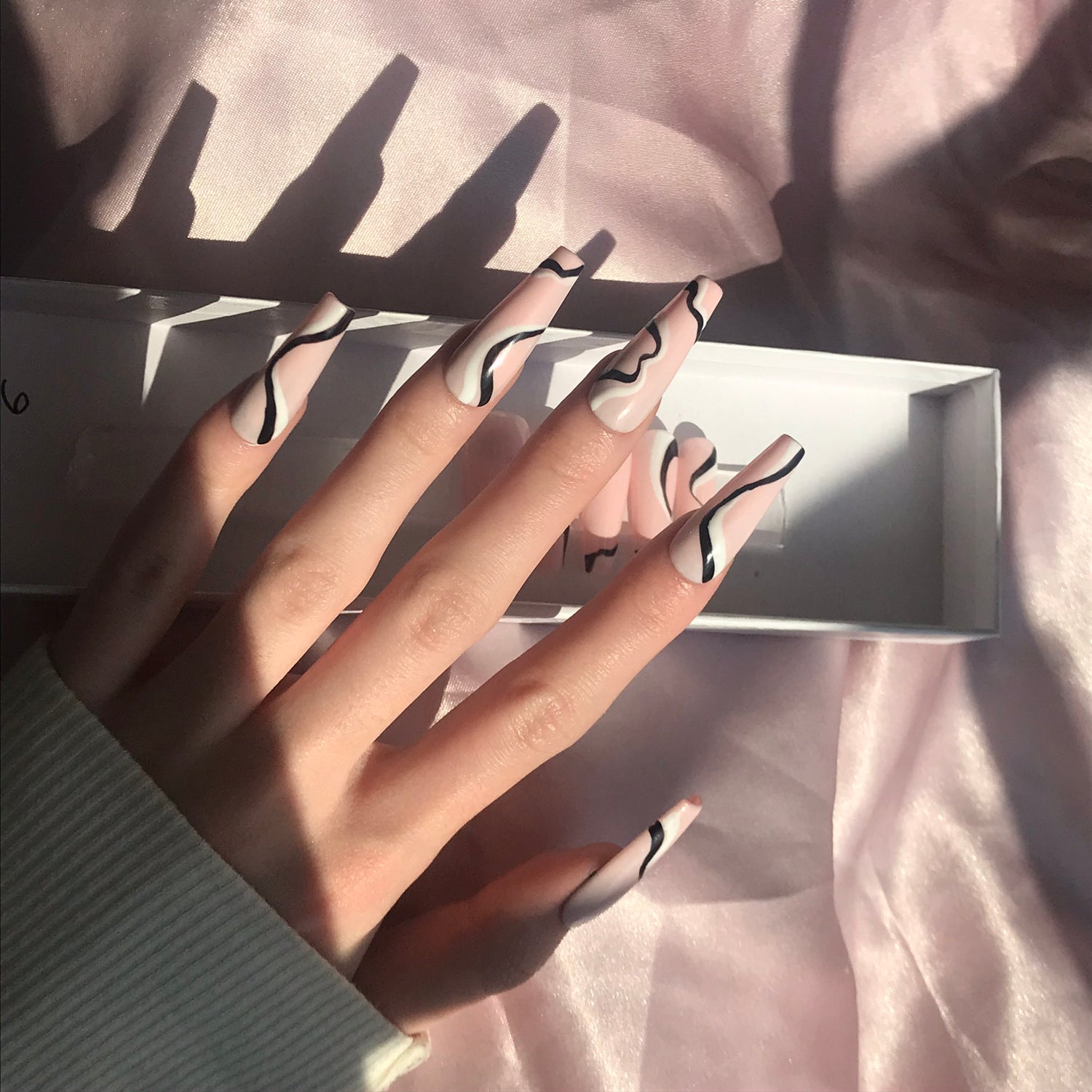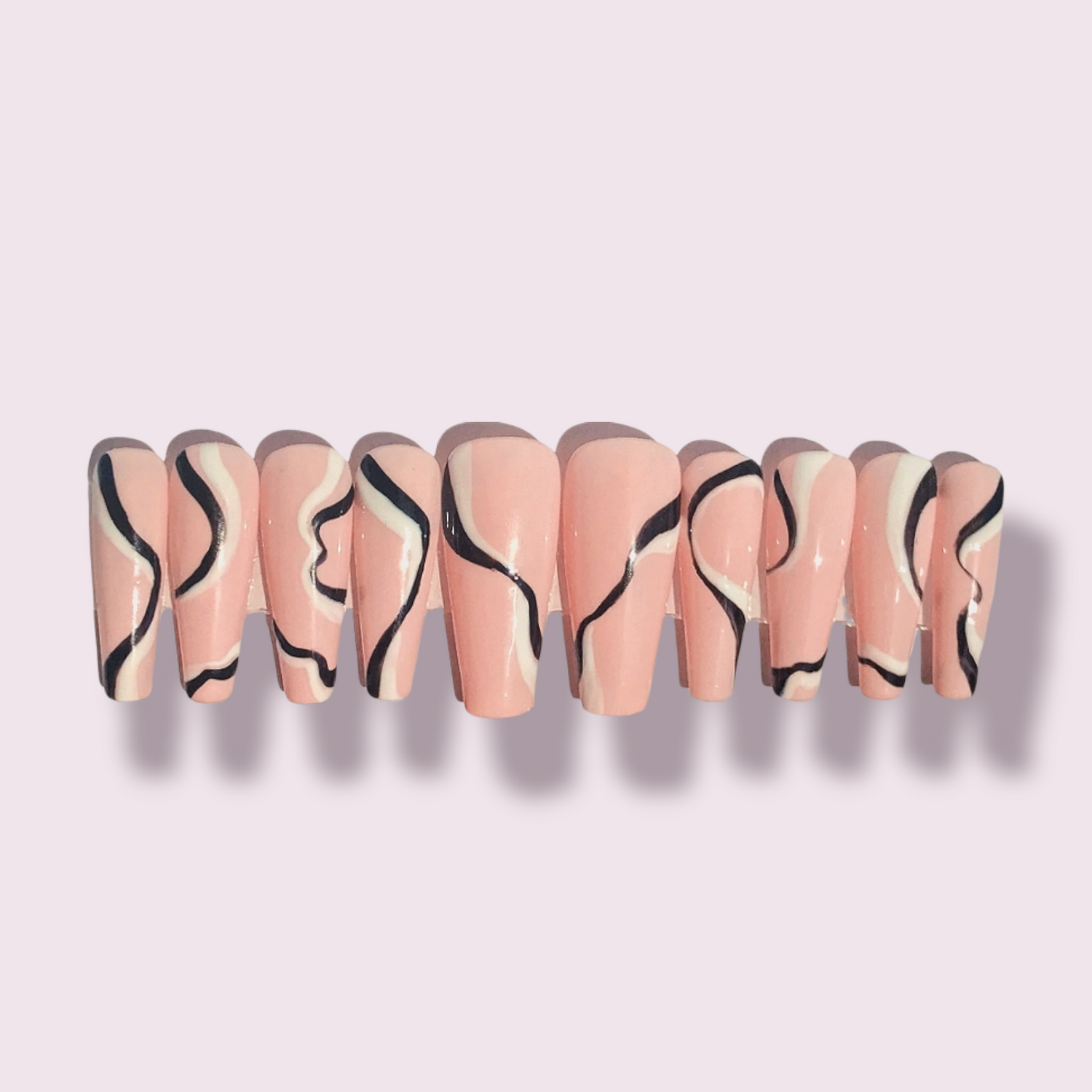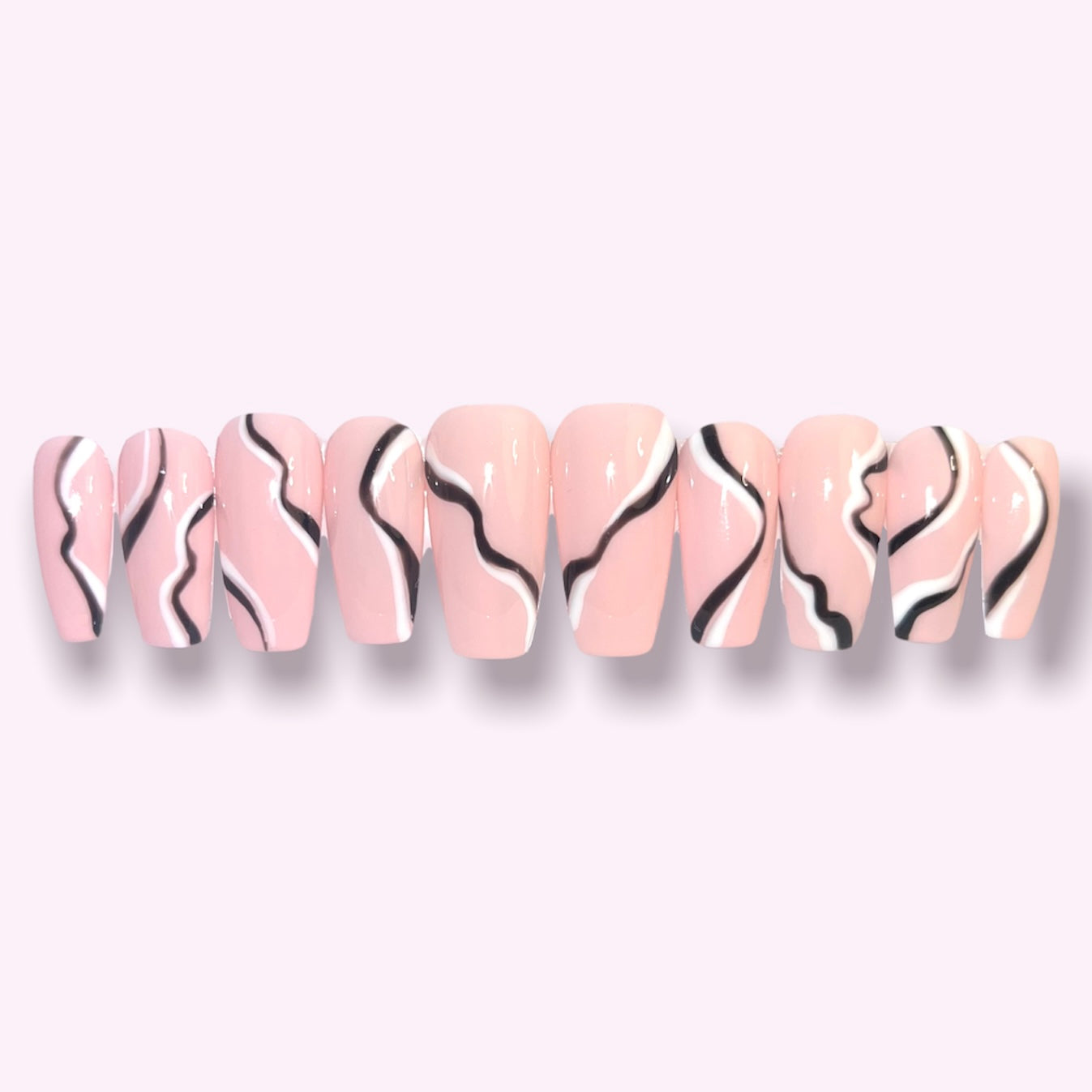 White & Black wavy lines drawn on light pink nail color.