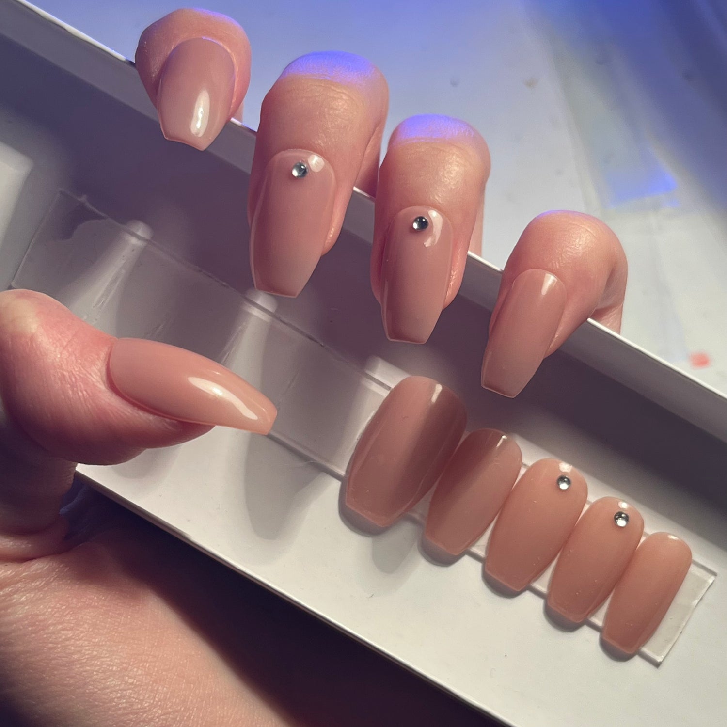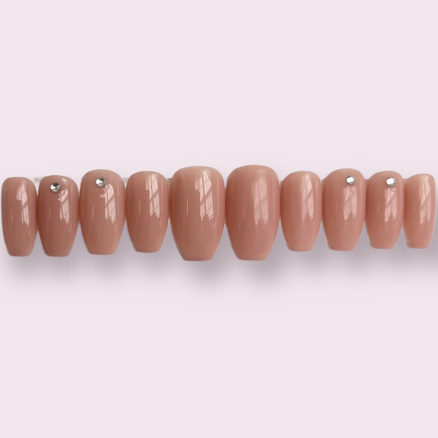 Pinky-brown nude jelly nails with two accent nails with gems.