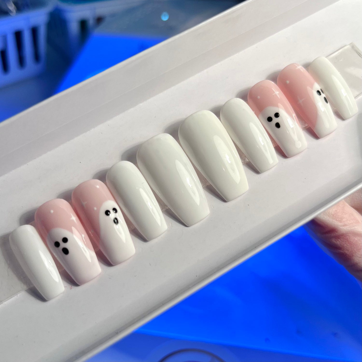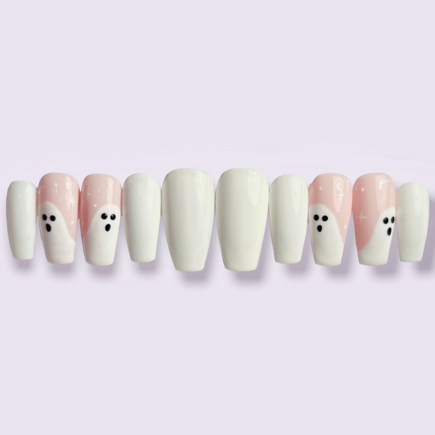 White nails with two accent nails featuring hand drawn ghosts and hand drawn sparkles. Part of the Halloween Collection.