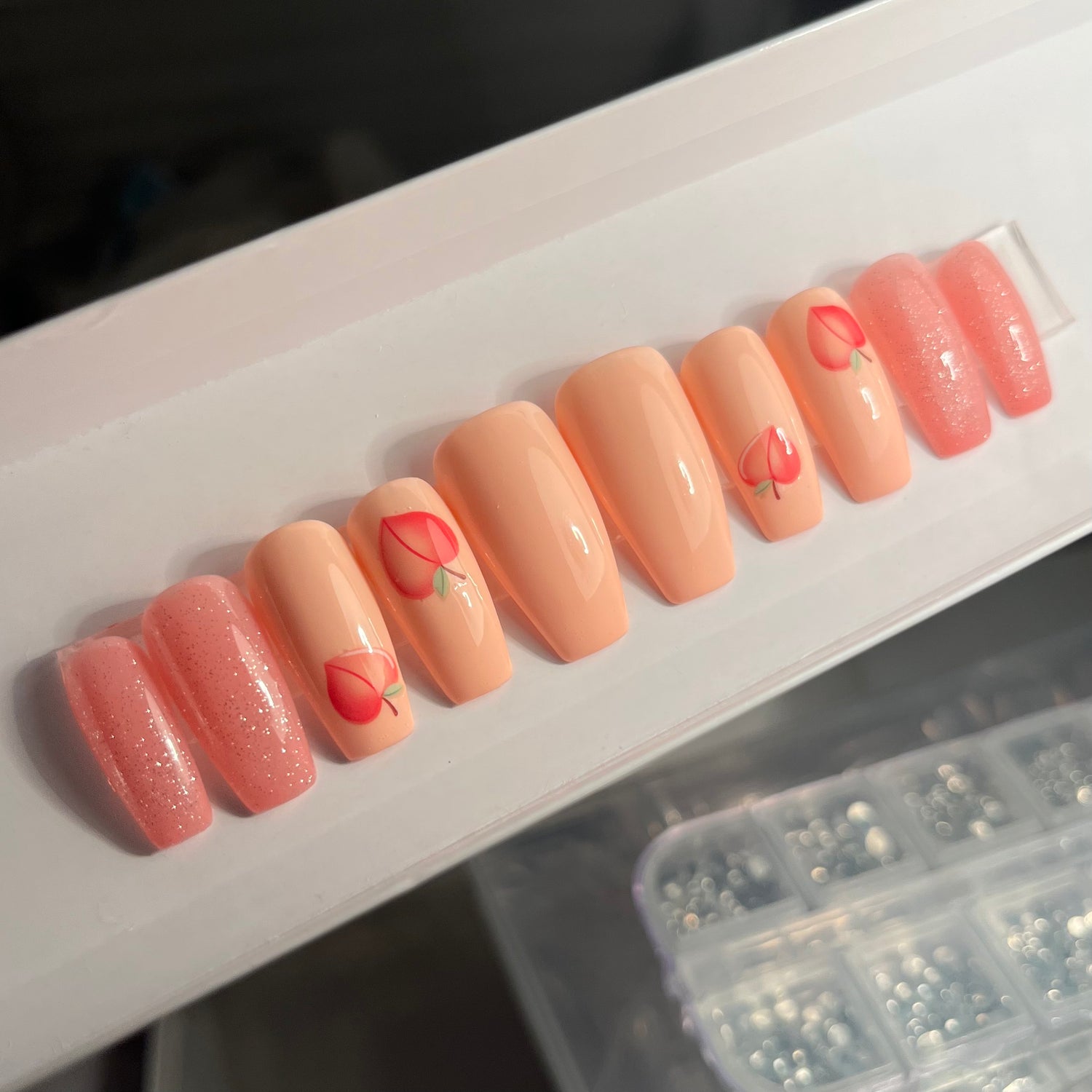 Peach nails with peach decal stickers, and two pink glitter jelly nails.