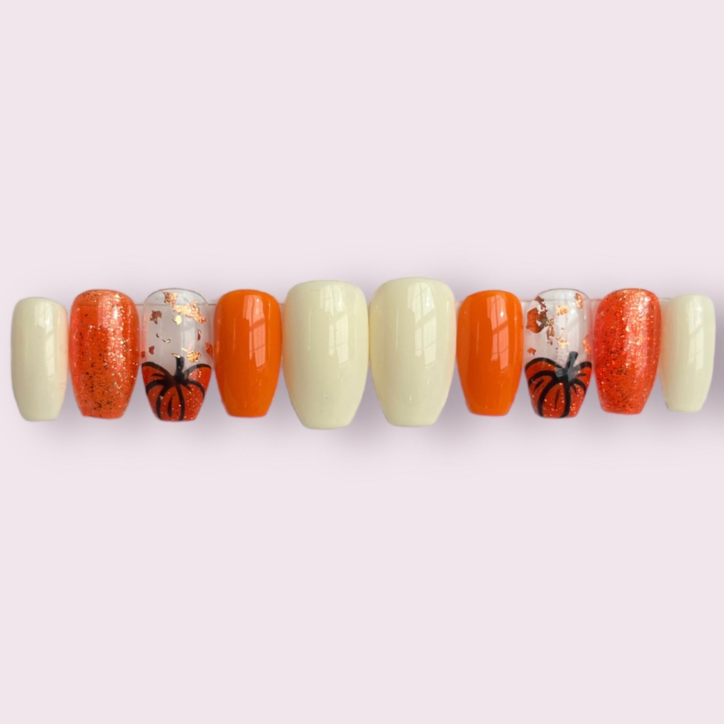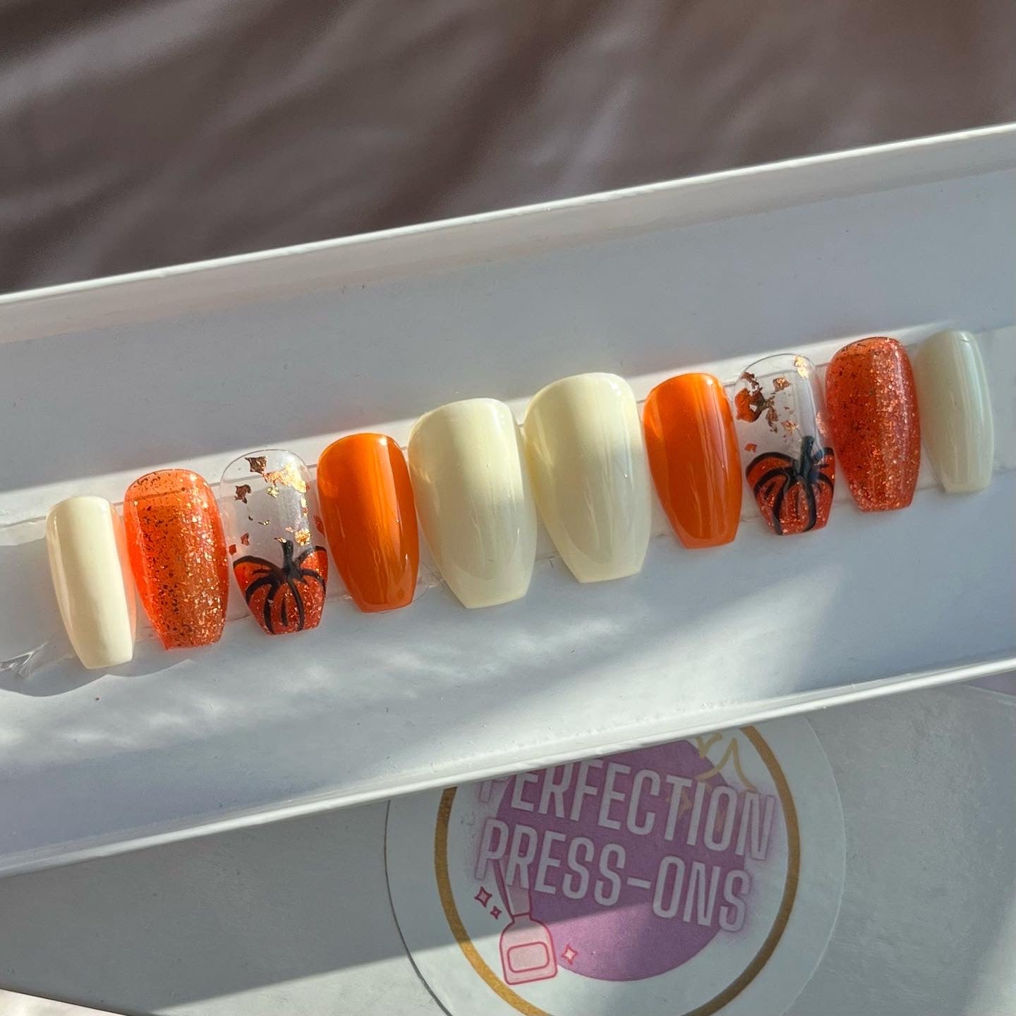 Hand painted pumpkin accent nails with gold flakes, an orange sparkle accent nail, and orange and white base color nails.