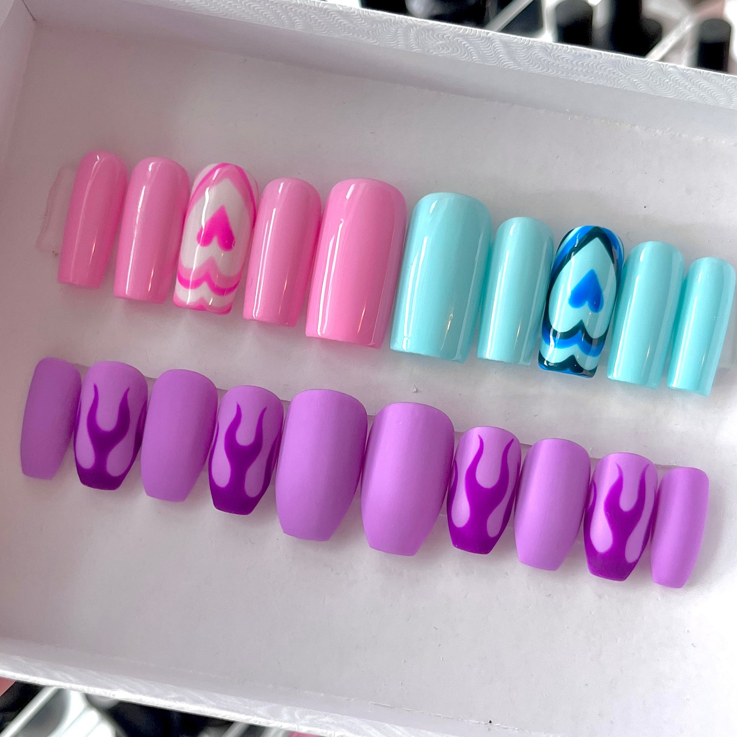 Purple nails with hand painted dark purple flames.