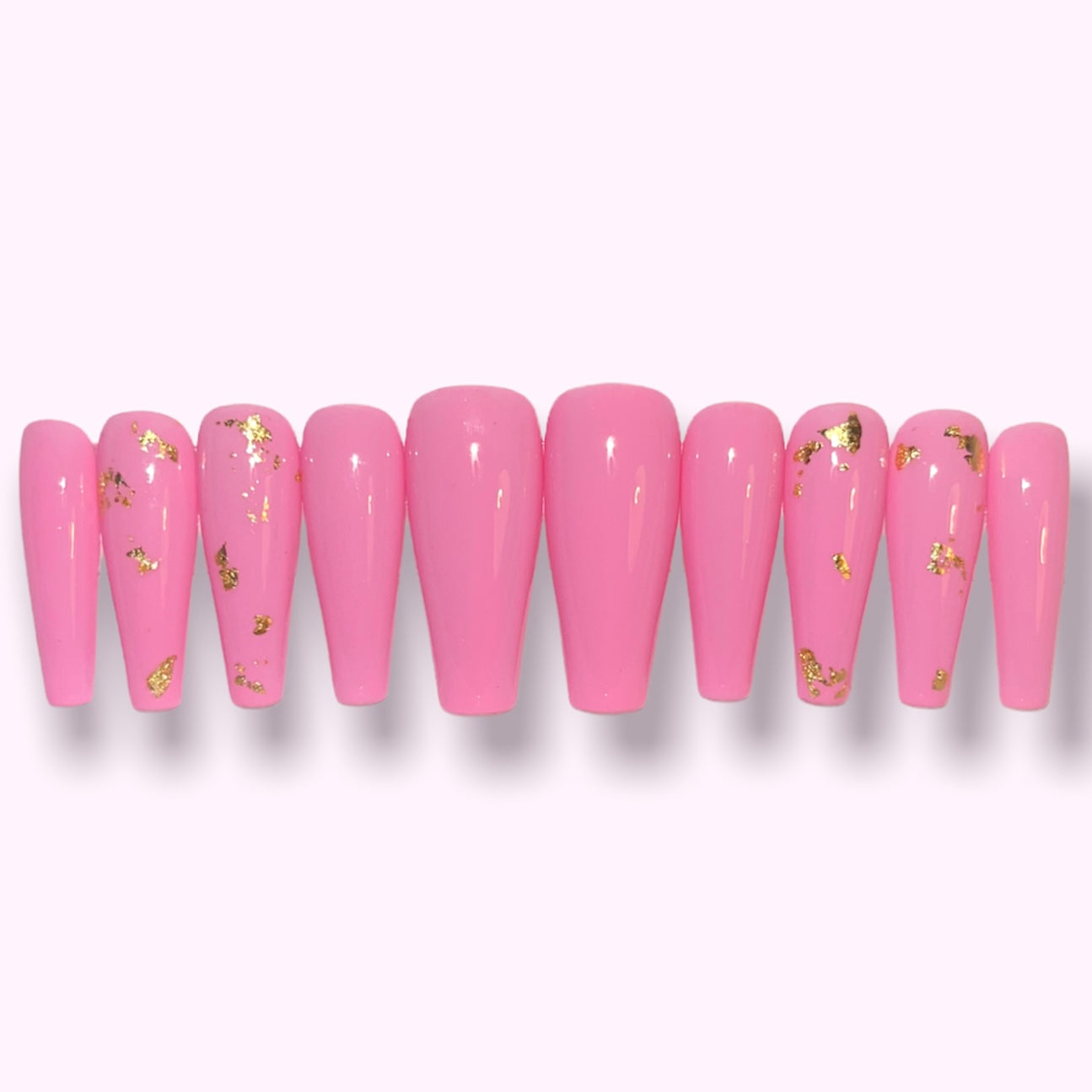 Light pink nails featuring two accent nails with gold flakes.