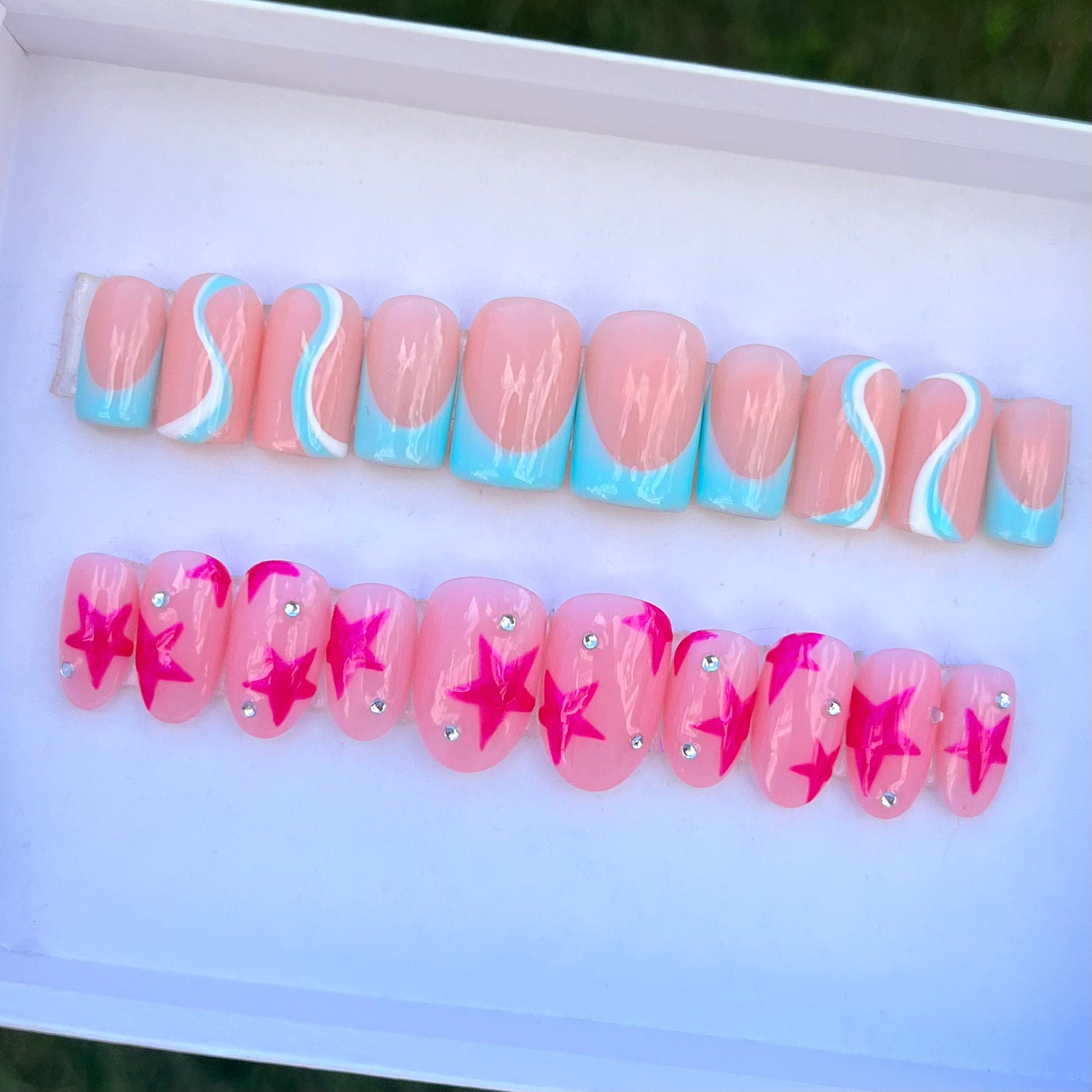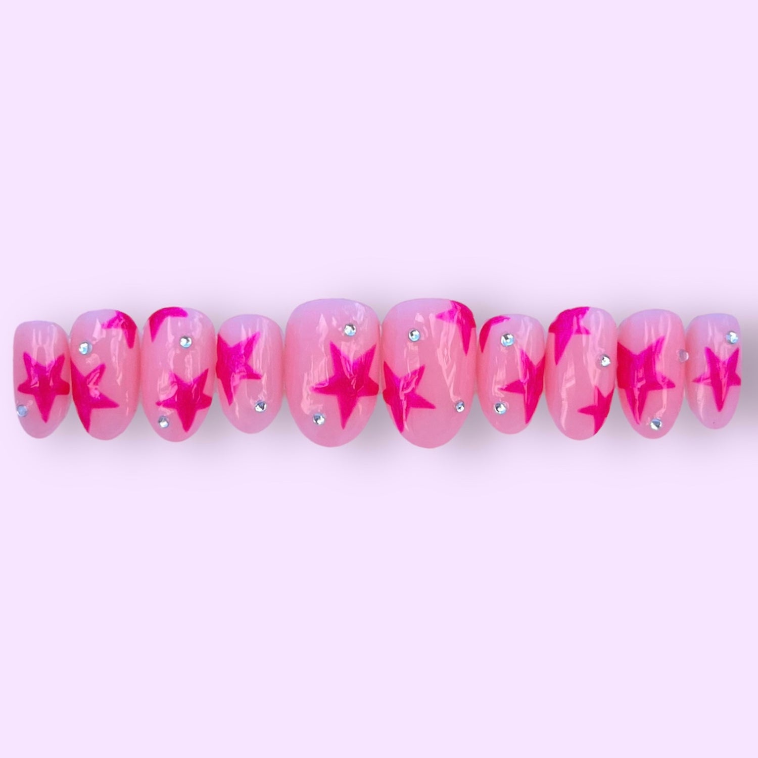 Glittery pink stars over a sheer pink base, with added gems on top.