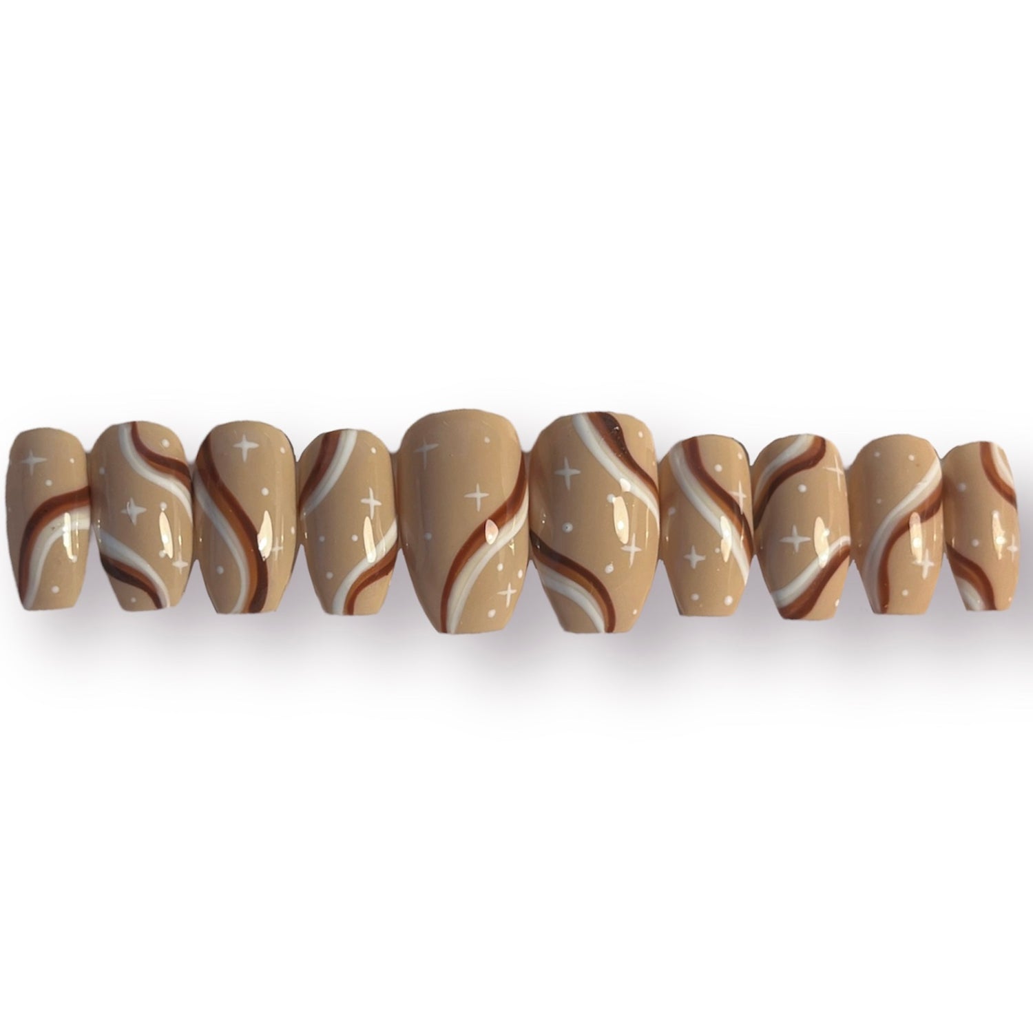 Brown monochrome swirl design with hand drawn sparkles over a light brown base.